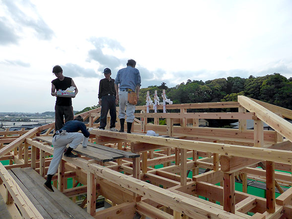 基本的に棟木が取り付けられるのは、家の基本構造を組み上げていくときの一番最後。そし て、このタイミングで時に行われるのが、「棟を上げる式」と書いて「上棟式(じょうとう しき)」。