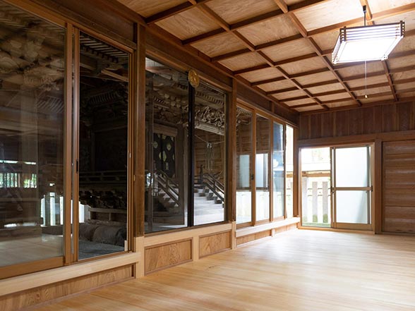 幣殿の中は全体的に木材で構成されている一方で、窓枠は利便性を考えて既製品を使ってい ます。ですが、サッシの色を選んだり、少し工夫をすることで、木の空間に馴染んだ窓を取 り付けることも可能です。